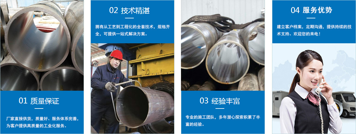 目前公司品種規(guī)格為:內徑直徑30mm—300mm,壁厚為2mm—40mm。技術條件為:內孔精度H5—H10,內孔粗糙度Ra≤0.63um,直線度≤0.3mm/m。鋼號是20#—45#、16Mn、27SiMn及部分低合金鋼,標準GB8713-88。規(guī)格為40-300*2-40MM,長度為2-12M的各種類型油缸管,年產銷售能力3萬噸。公司設備先進,工藝優(yōu)化,檢測手段完善。